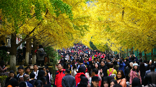 帽子峰林场最为美丽的景色是芳坑街的“黄金大道”,在这秋高气爽之时,这里冠盖如云,落日熔金,茂密的树冠洒满阳光,远山近岭,一片金黄。望景区内外皆茫茫人海,矮的看屁股、高的看人头。导游告诉我们,帽子峰银杏迎来黄金周,火热不亚于春节长假!在这棵树下合影的人是一波接一波。朝来的路看回去,每一段都是很多人,真是无法预想到了下一个周末是不是都人挤人了呢?就如同十一的香山观赏红叶的景象!